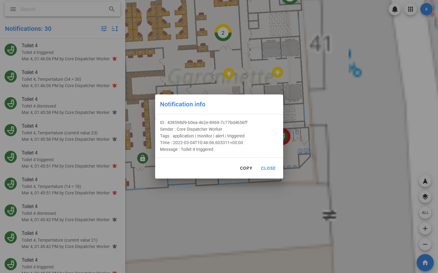 You can view the latest notifications by clicking on the bell in the upper right corner. In the list that opens, you can view all notifications or select a tab with notifications of a specific type, for example, only alarms.