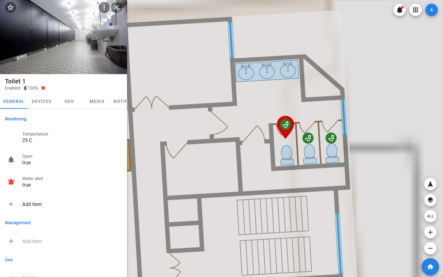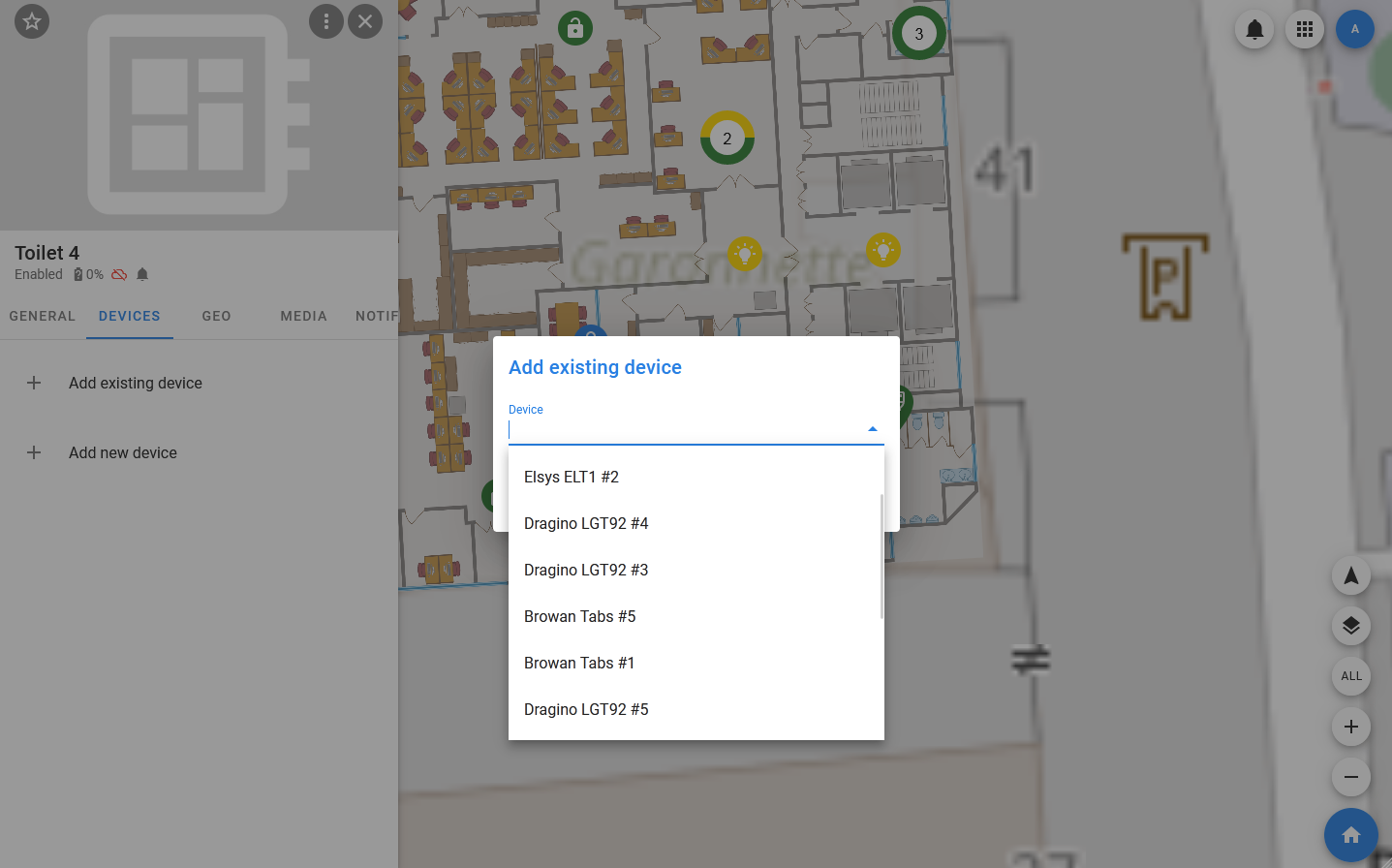 - DEVICES — a tab that displays a list of devices added to the object. When you select a device in the list, its card will open, containing information about its properties.
